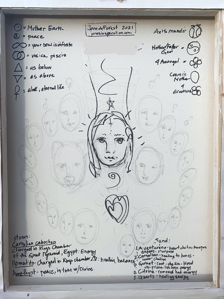 This is an example of a sketch I do during our session as I intuit the healing required and tools and energies I need to infuse into your final healing portrait. This sketch is included on the back of the final canvas portrait.