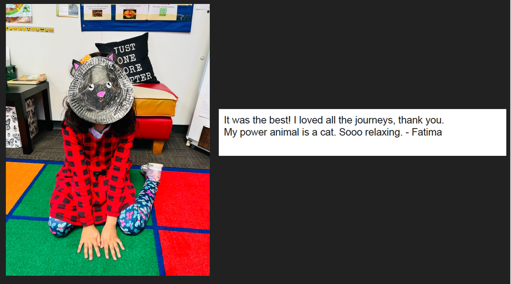 “After playing for a while I talked to Clive (7) about going on your Shamanic Journey and he said yes! and quickly laid on the floor, covered himself, put a pillow under his head and listened carefully. There was a tongue drum there so I used that, and he was gone! After, I brought him back, he was ready to draw his spirit animal and when he told me the answer to his question and message, I asked if he would write it down and he agreed :)